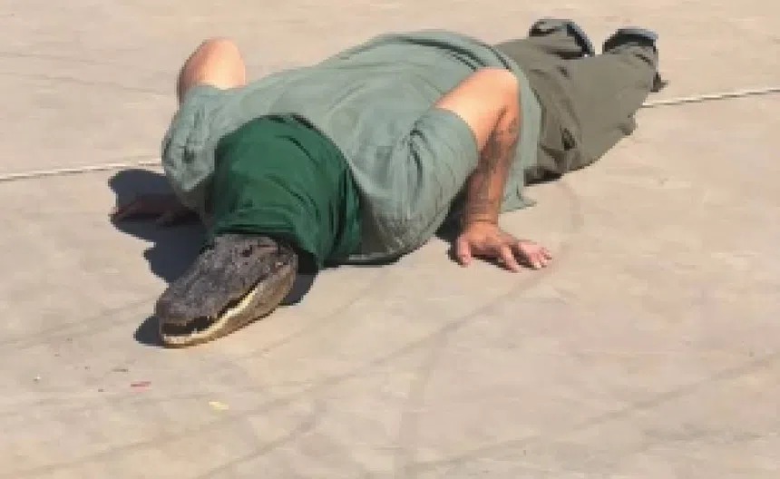 En las imágenes se observa a una persona caracterizada en forma de cocodrilo.