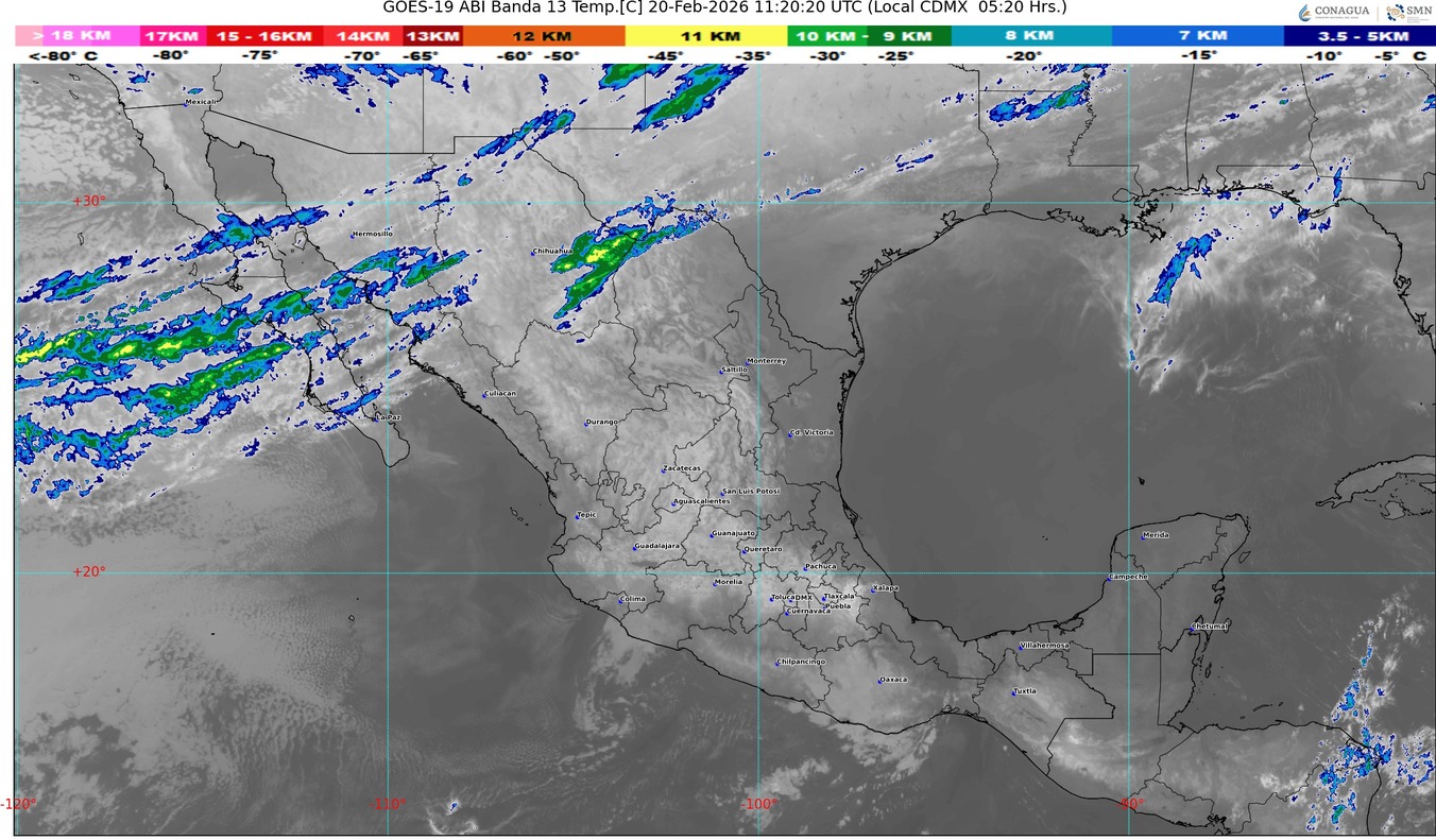 Por otra parte, se mantendrá el anticiclón en niveles medios de la atmósfera generando tiempo estable, con baja probabilidad de lluvia y ambiente vespertino cálido a caluroso en gran parte de la República Mexicana; prevalecerá la onda de calor en San Luis Potosí (centro), Querétaro (centro), Hidalgo (centro y suroeste), Jalisco (centro), Michoacán (suroeste) y Oaxaca (centro y oriente).