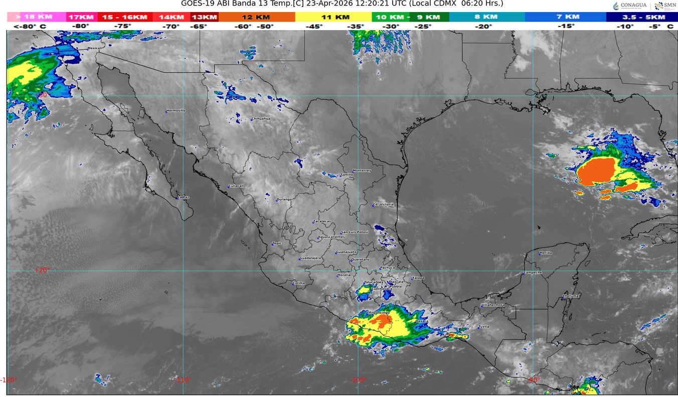Una circulación anticiclónica en niveles medios de la atmósfera mantendrá la onda de calor en Durango (noroeste), Sinaloa (centro), Nayarit (sur), Jalisco (oeste y sur), Colima (este), Michoacán (sur y suroeste), Guerrero (noroeste, este y sur), Morelos y Oaxaca (sur) y dando inicio a partir de este día en Tamaulipas (suroeste), San Luis Potosí (centro y sur), Querétaro (centro), Hidalgo (norte y este), Veracruz (centro) y Chiapas (noroeste).